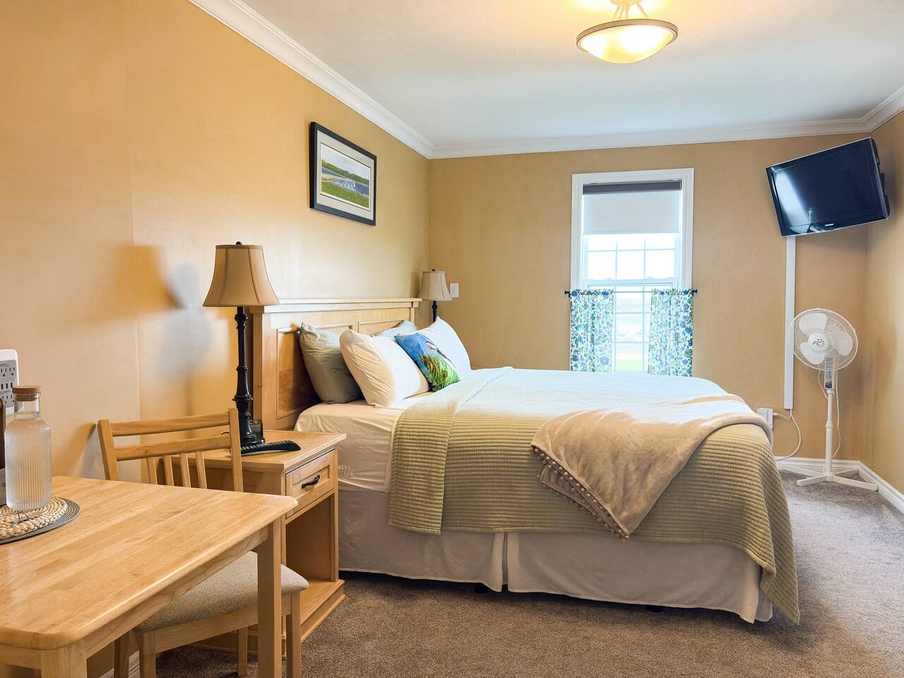Wake up to sweeping ocean views in this king room, just steps from the Gros Morne Theatre Festival and Shallow Bay Beach. Enjoy a full hot breakfast each morning, robes, eco-friendly soaps, mini-fridge, Wi-Fi, and a cozy sitting room with books and binoculars. Perfect for couples or travelers seeking comfort and a true Gros Morne experience.
